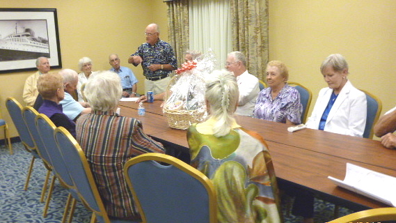 | Norm addressing the group on Saturday evening. Facing the camera on Norm's right is Buddy DiLorenzo, Pauline Nystrom Bearse, and Eliot Bearse. Facing the camera on Norm's left are Bjorn Thompson, Helen Still (Artie's girlfriend), and Gail Thompson. |